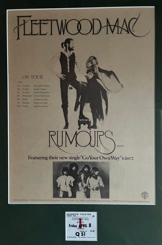 FLEETWOOD MAC- 1977 “ Rumours tour “ concert advert and original ticket for the Rainbow , London concert on 12/5/1973 . Framed