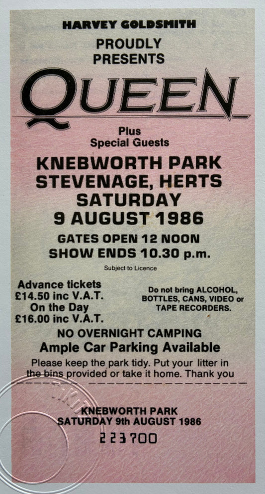 QUEEN - 9/8/1986 Knebworth Park framed ticket giclee print