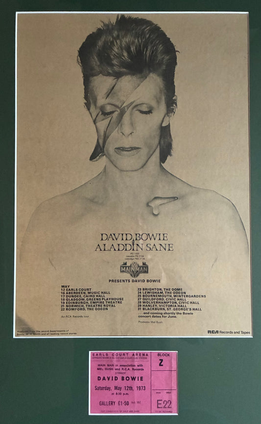 DAVID BOWIE - 1973 “ Aladdin Sane tour “ concert advert and original ticket for the Earls Court, London concert on 12/5/1973 . Framed