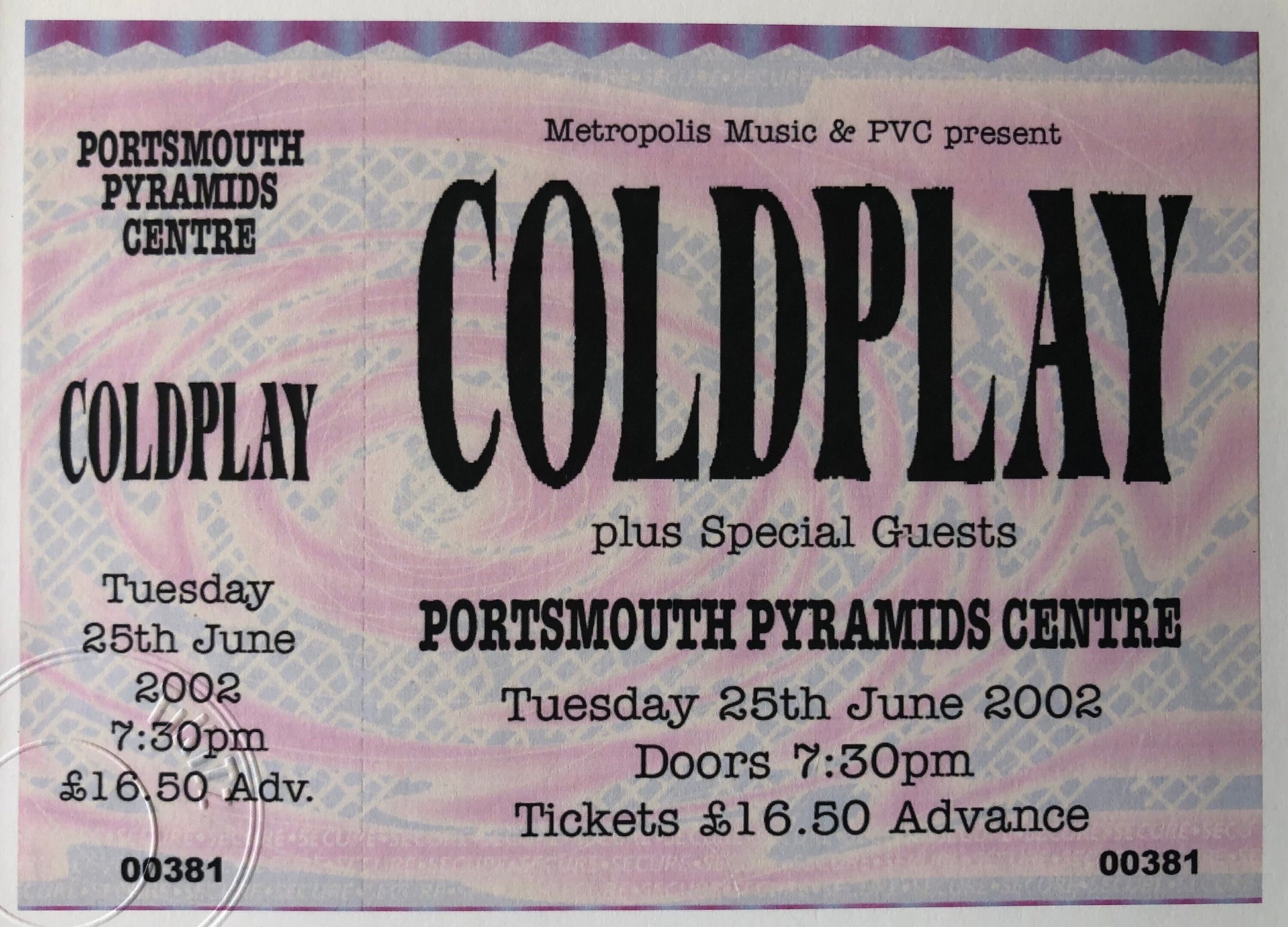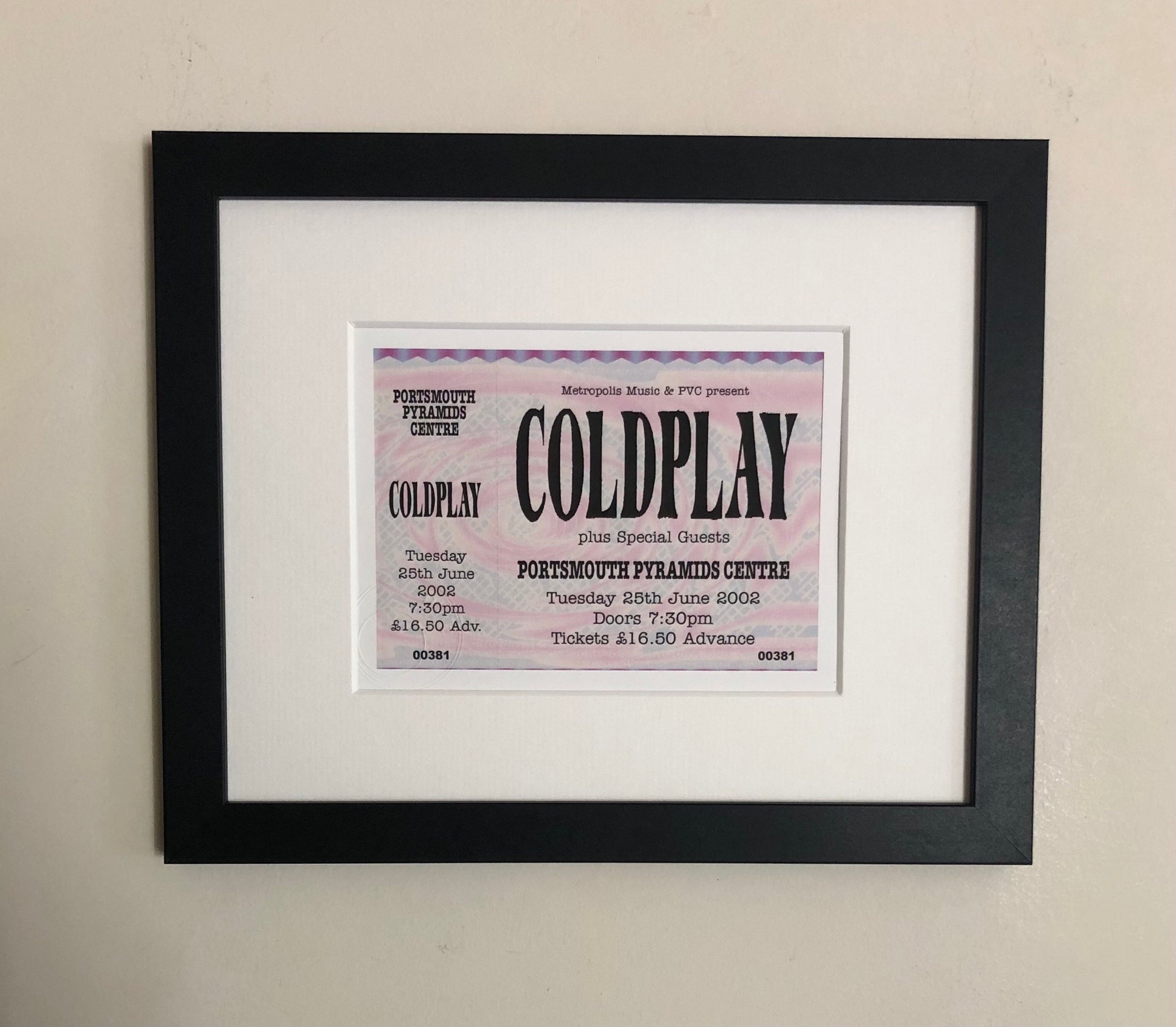COLDPLAY- 2002 Portsmouth Pyramids Centre framed ticket giclee print