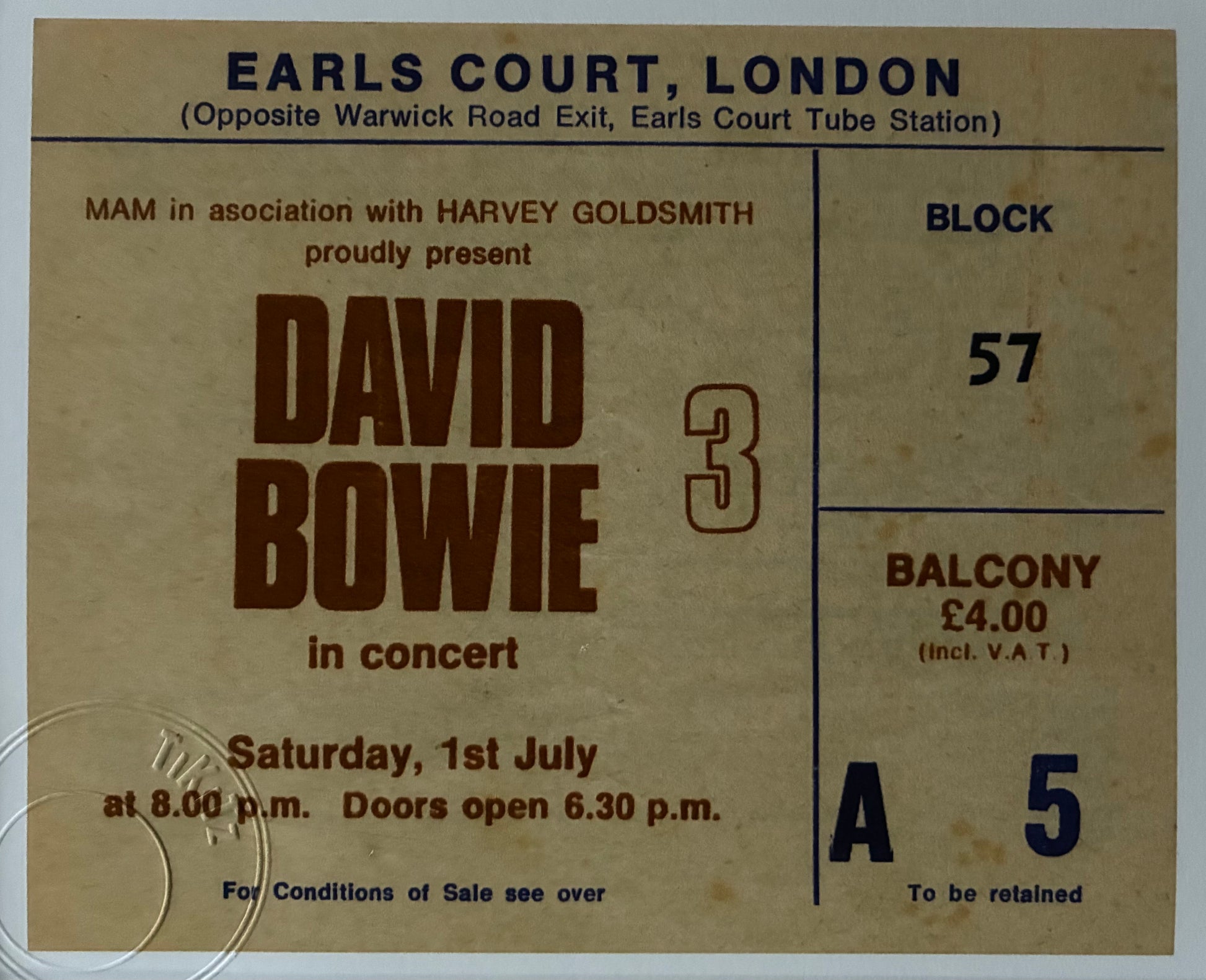 DAVID BOWIE - 1978 Earls Court (3rd night of a 3 night residency )London framed ticket giclee print