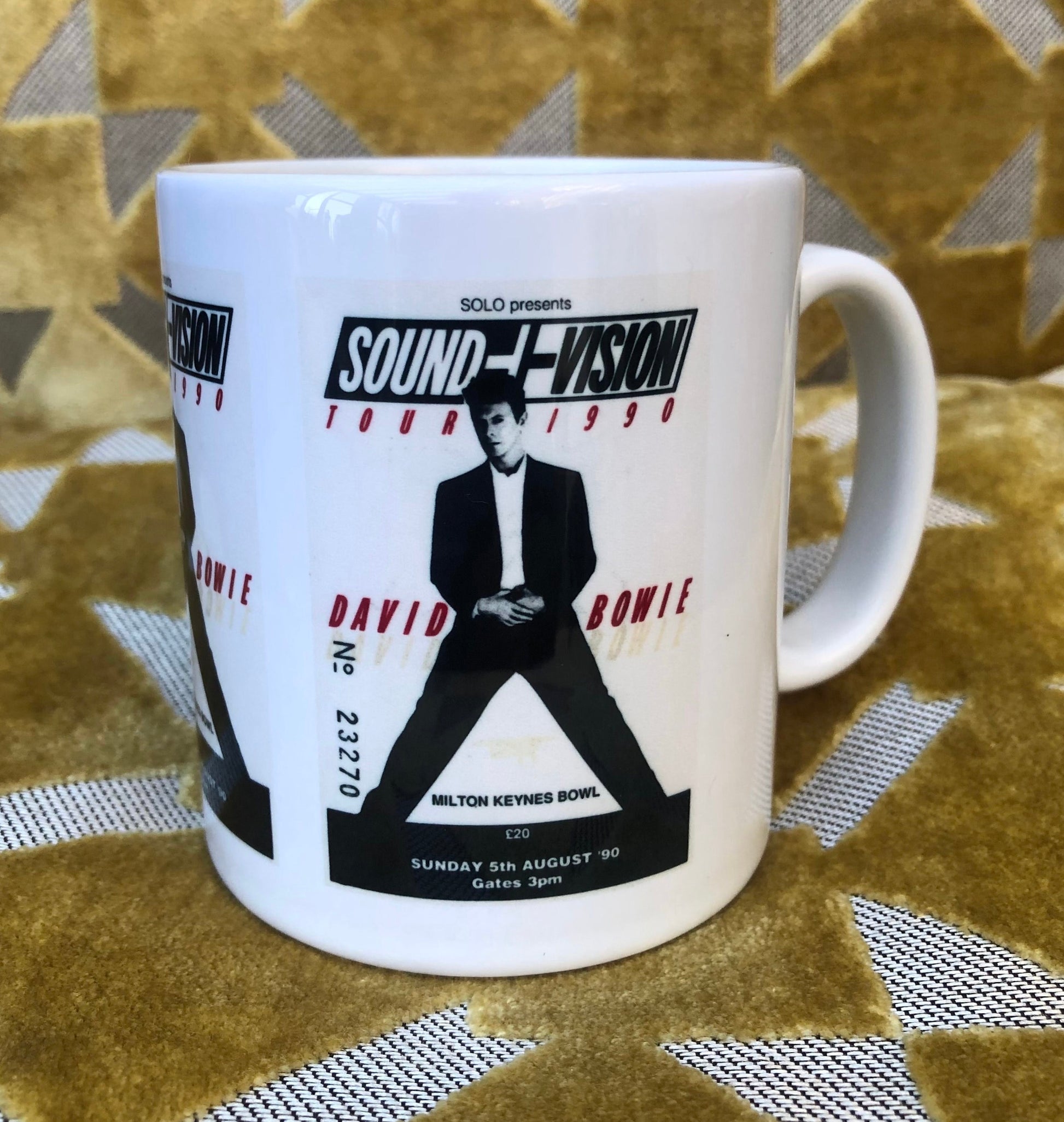 DAVID BOWIE - 11oz ceramic mug featuring the 1990 “ Sound and Vision tour” Milton Keynes Bowl ticket. Featuring three tickets surrounding the mug.
