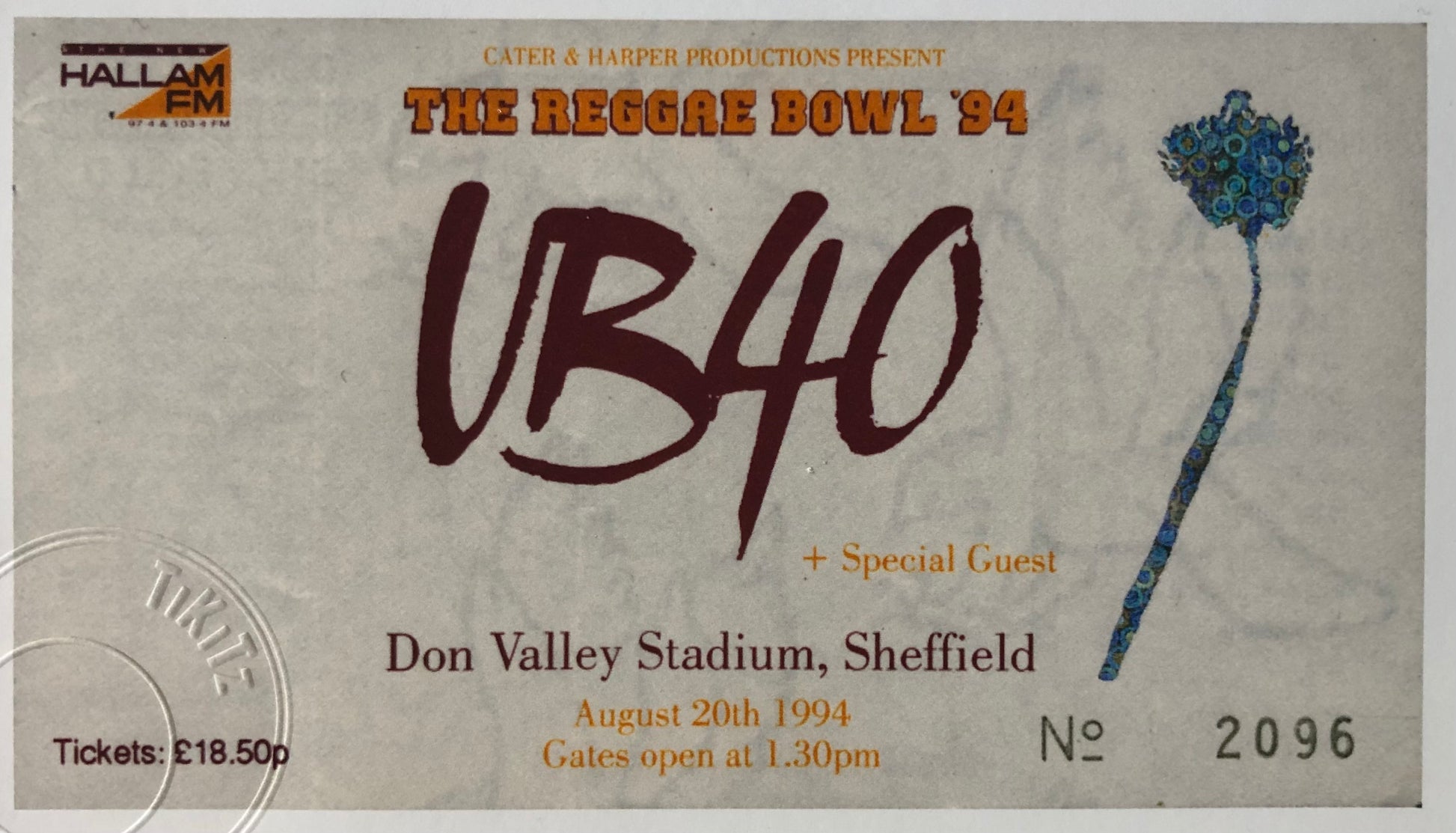 UB40 - “ THE REGGAE BOWL ‘94” Don Valley Stadium , Sheffield framed ticket giclee print